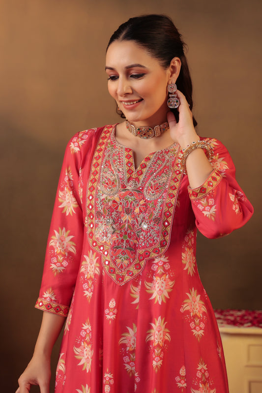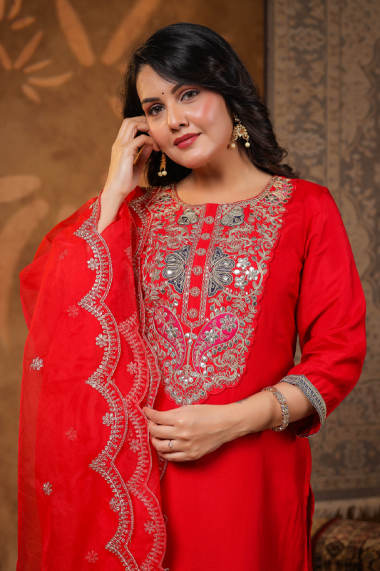 Plus Size Peach Poly Silk Kurta With Palazzo and Dupatta