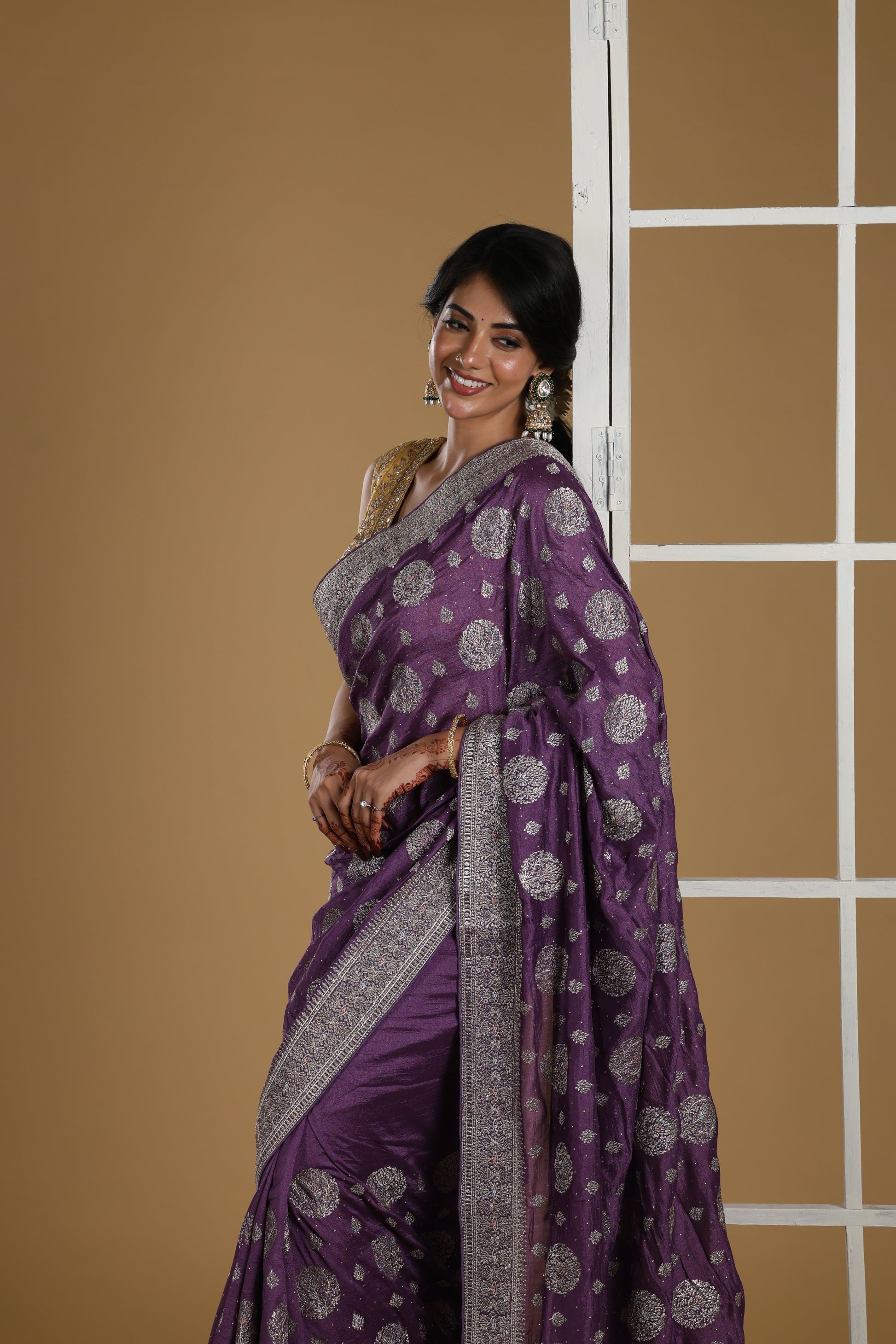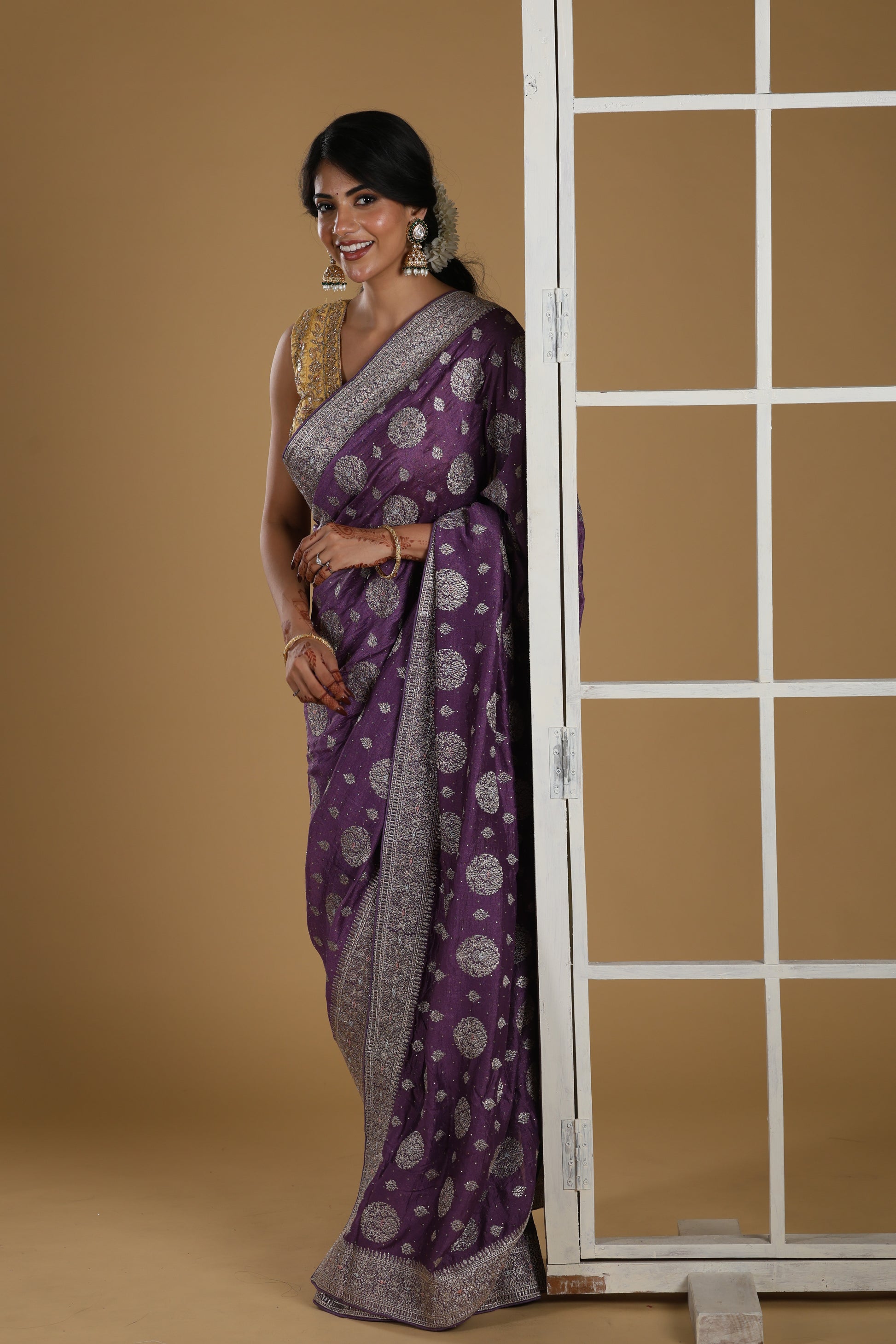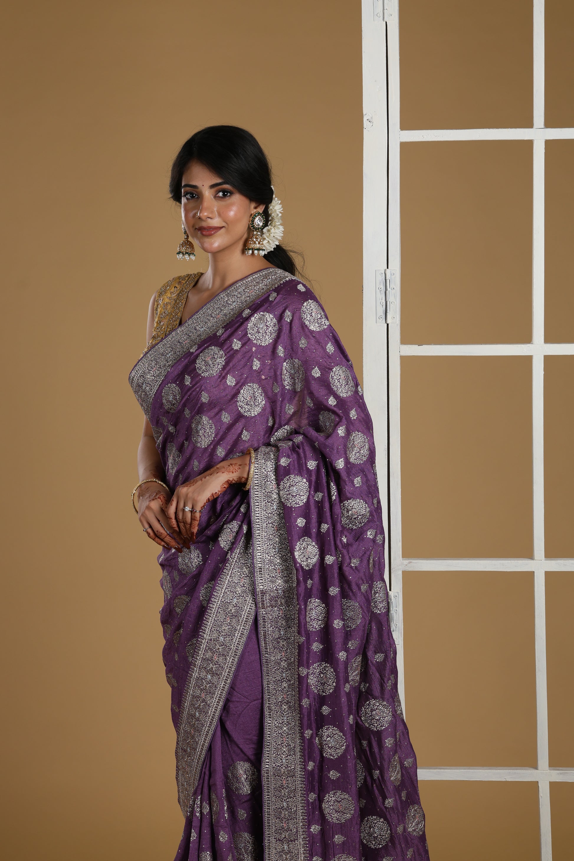 This Beautiful Georgette Saree in a soft pastel purple shade is gracefully adorned with a gold work border, giving it a refined and festive charm. Made from lightweight georgette, it drapes elegantly while ensuring comfort and ease of wear. With a length of 6.5 meters, blouse included, and a height of 42, it offers a perfect fit for all body types. Weighing 1200 gms, this saree is ideal for festive gatherings, parties, and weddings where elegance and tradition come together beautifully.