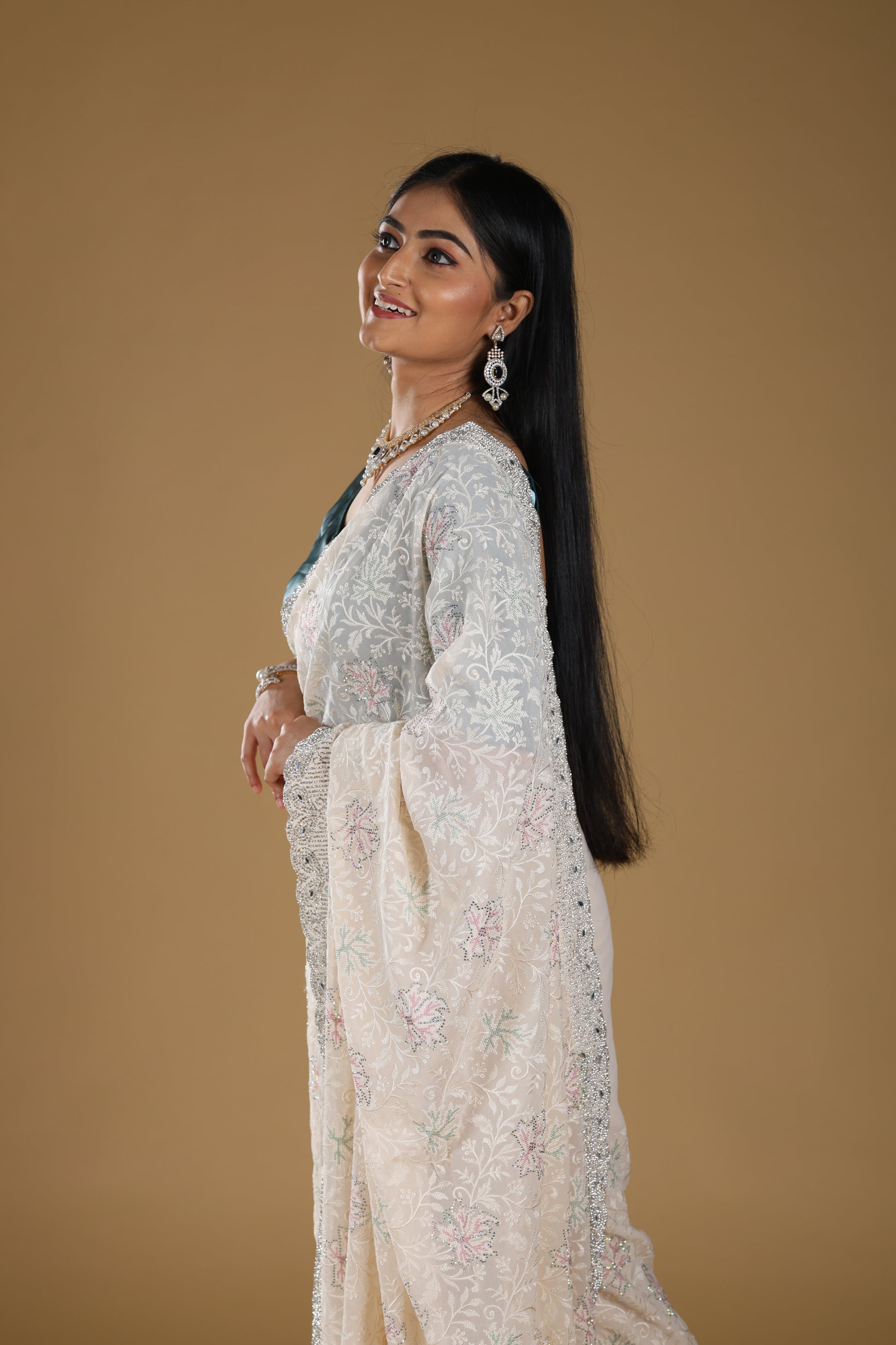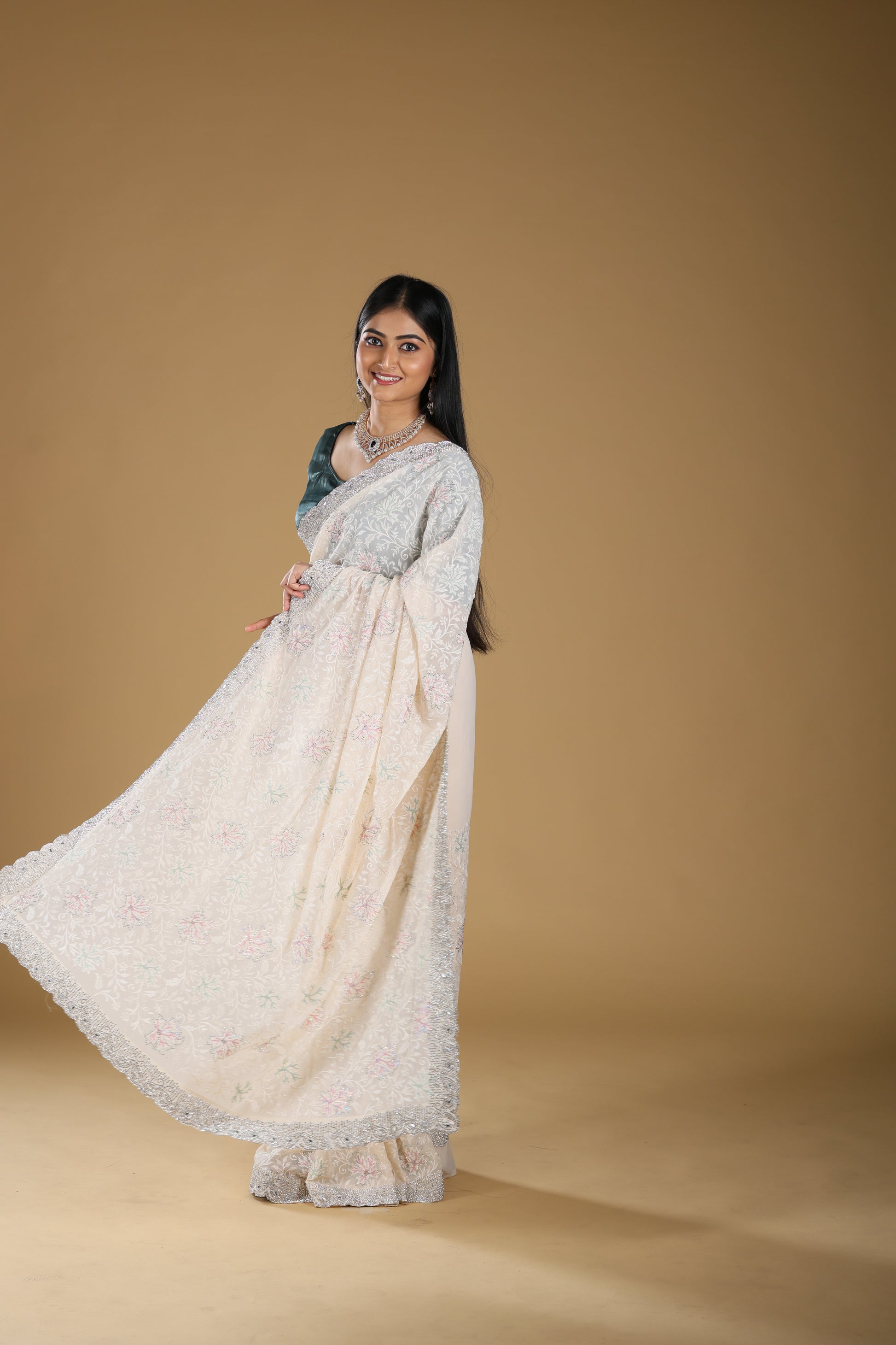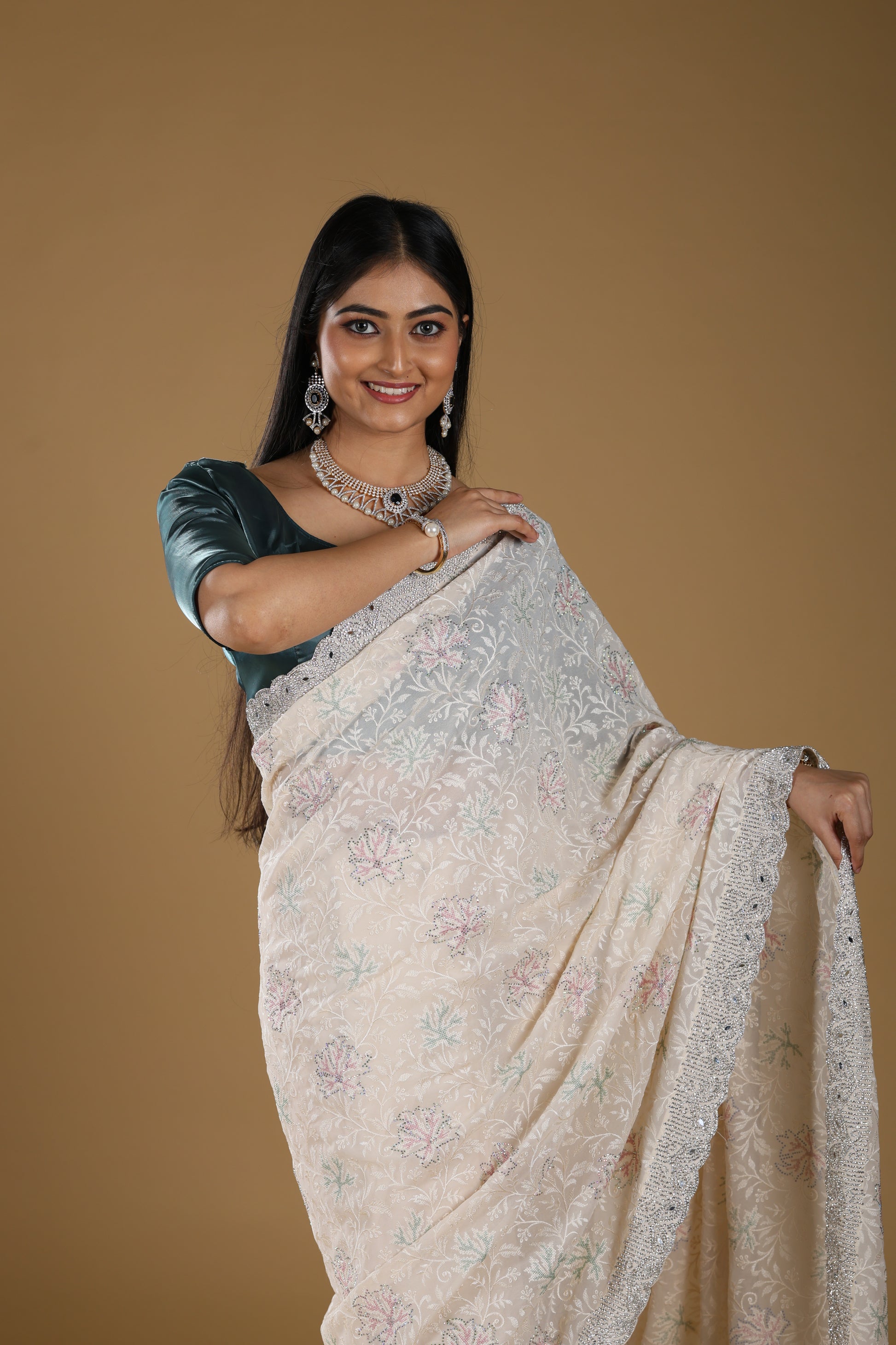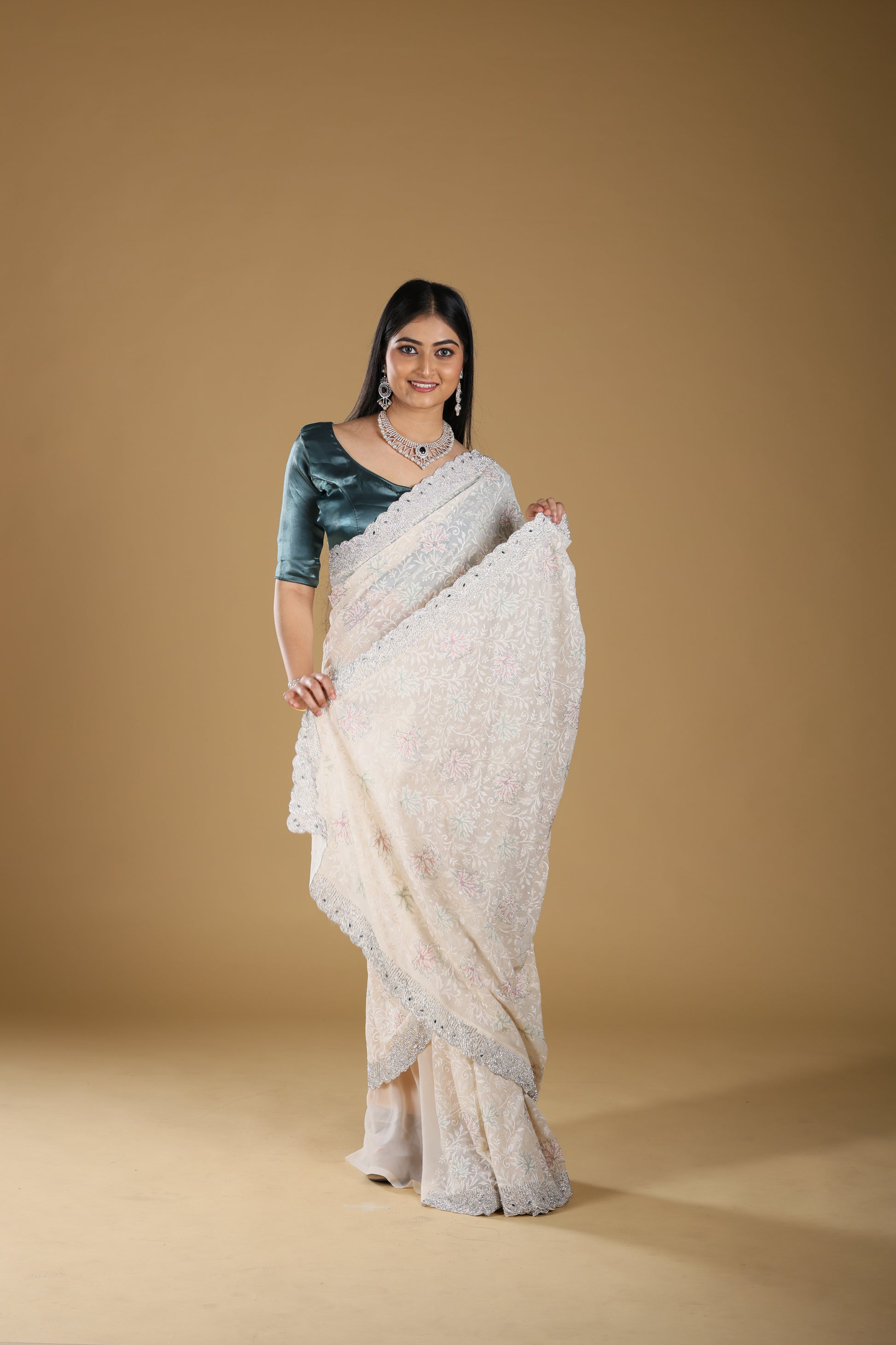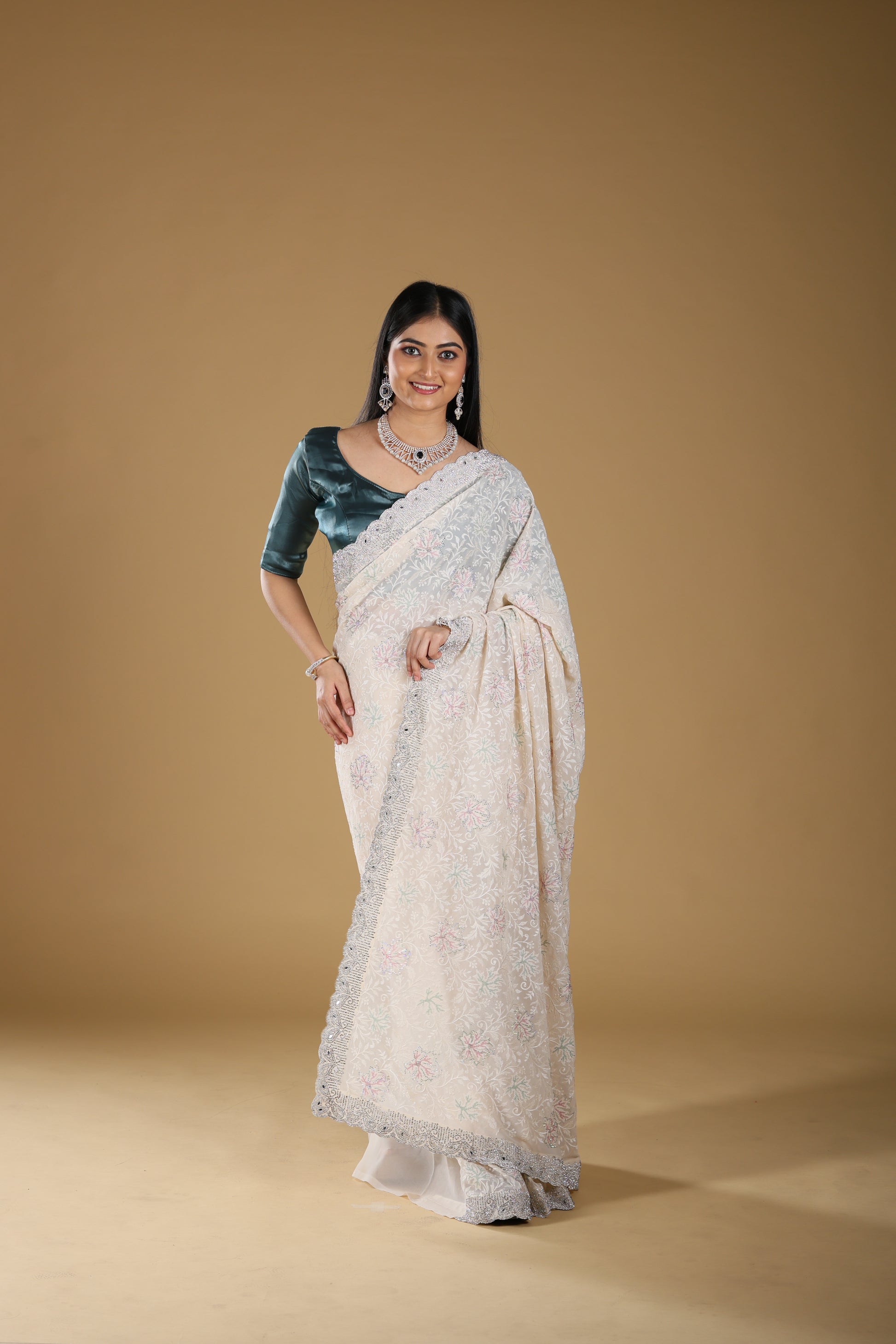 This Embroidery Georgette Saree in a classic off-white shade is a true blend of elegance and sophistication. Enhanced with delicate embroidery and a sparkling stone border, it brings a luxurious touch to your traditional attire. Crafted from premium georgette fabric, the saree drapes beautifully while offering comfort and durability. With a length of 6.5 meters, blouse included, and a height of 42, it is designed for a perfect fit. Weighing 2000 gms, this saree carries a rich, premium feel, making it ideal for weddings, festive occasions, and grand celebrations.