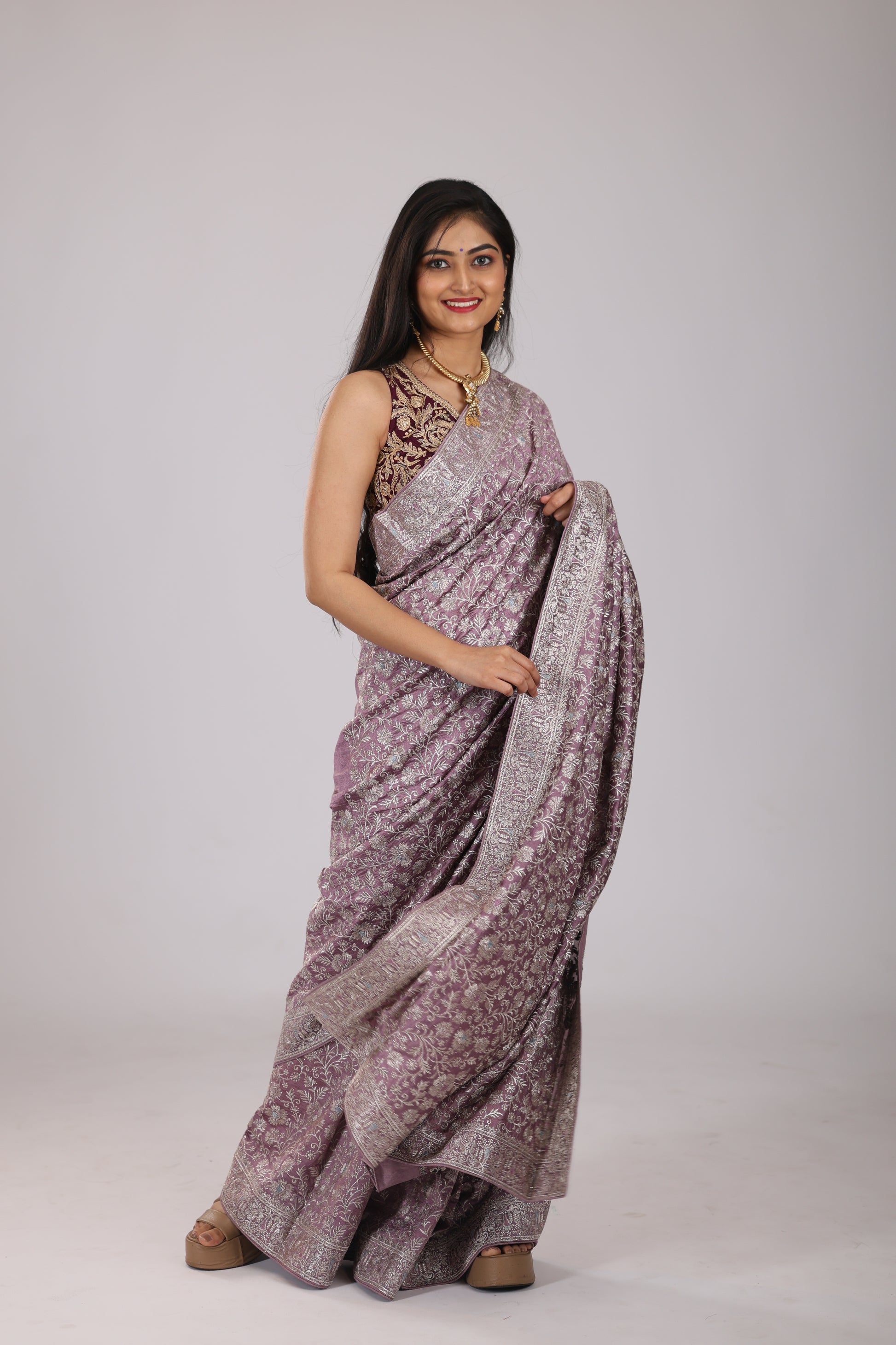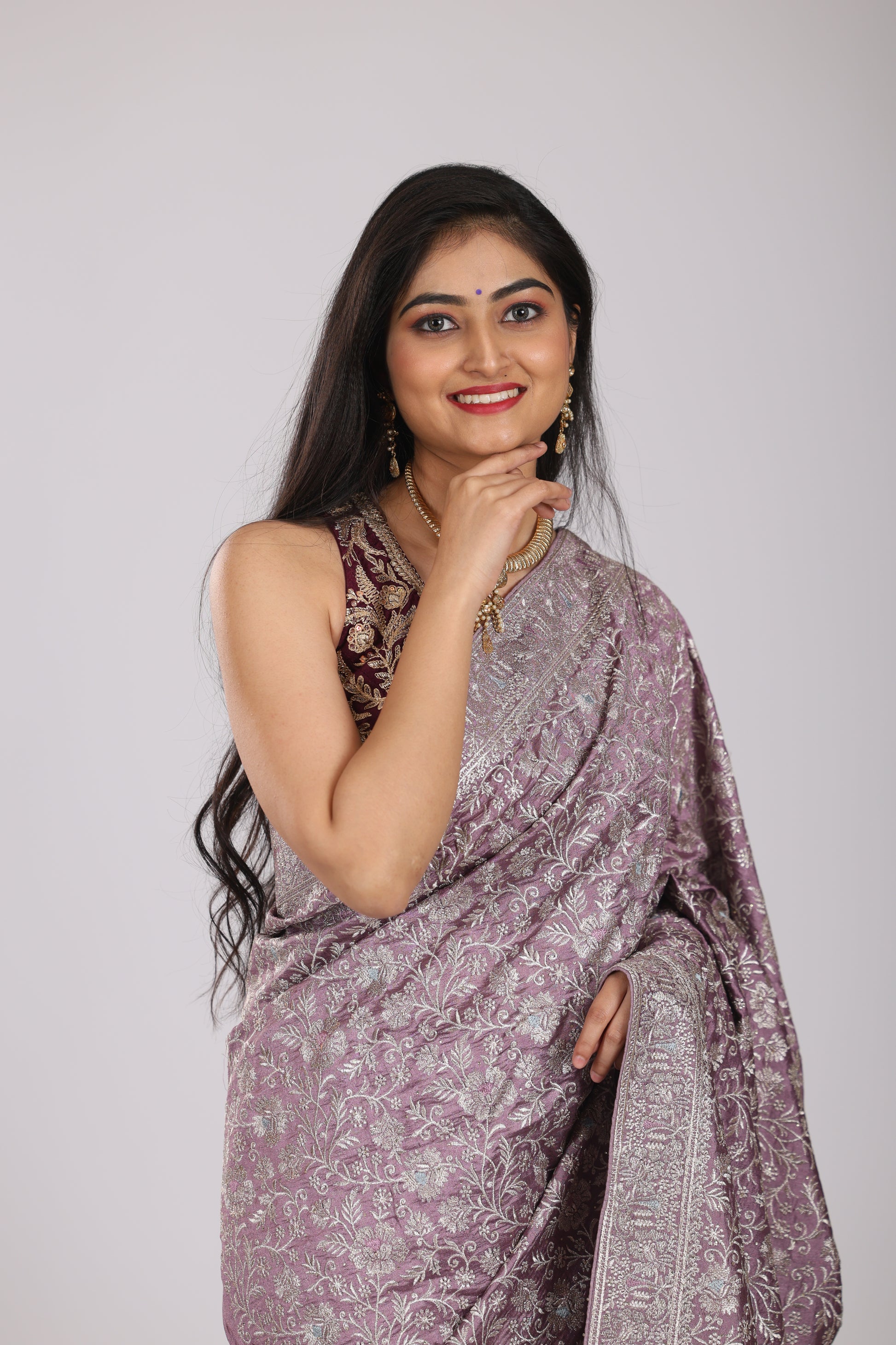 This Fancy Sequin Jimmichu Saree in a graceful pastel purple shade is designed to add sparkle and sophistication to your wardrobe. Crafted from premium Jimmichu fabric, it offers both elegance and comfort, making it perfect for festive and party occasions. With a length of 6.5 meters and a blouse included, along with a height of 42, it drapes beautifully to enhance your silhouette. Weighing 1200 gms, it is lightweight yet richly styled, ensuring you stand out with effortless charm.
