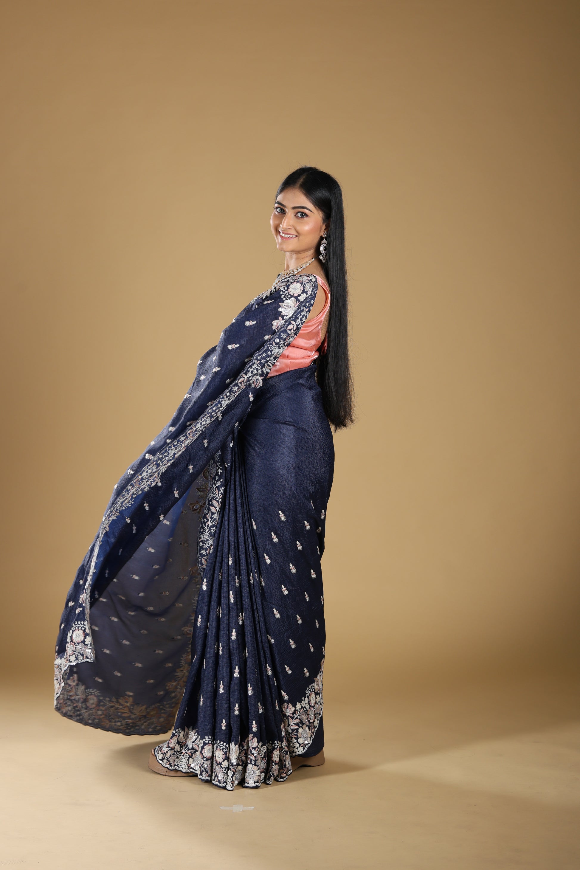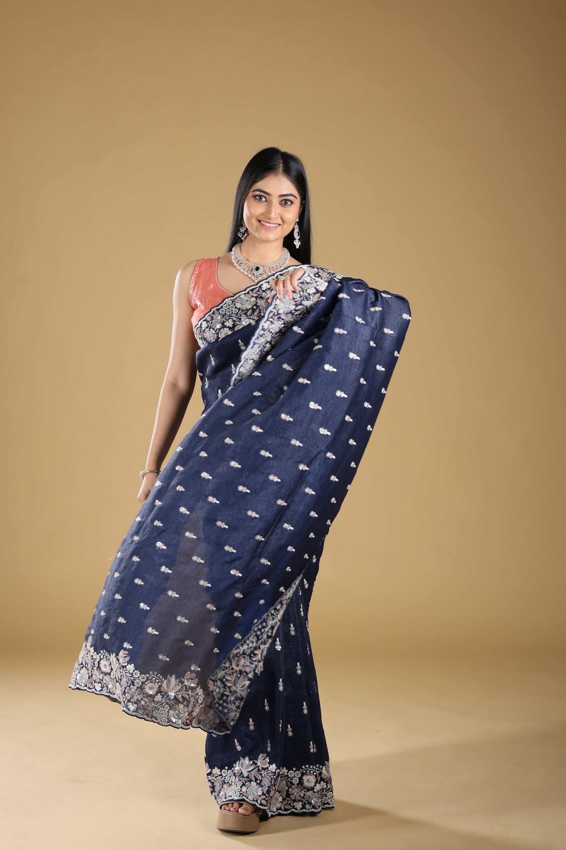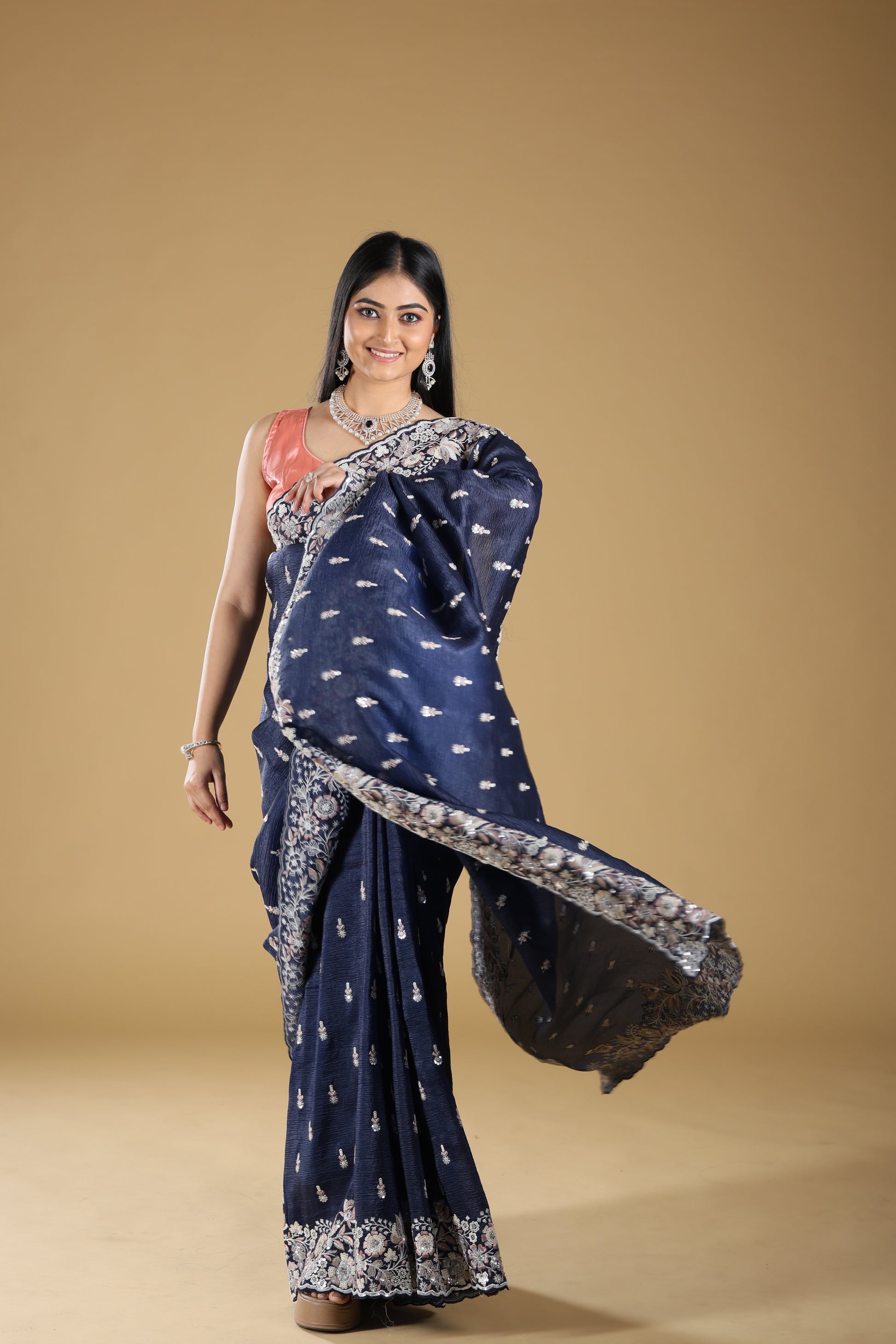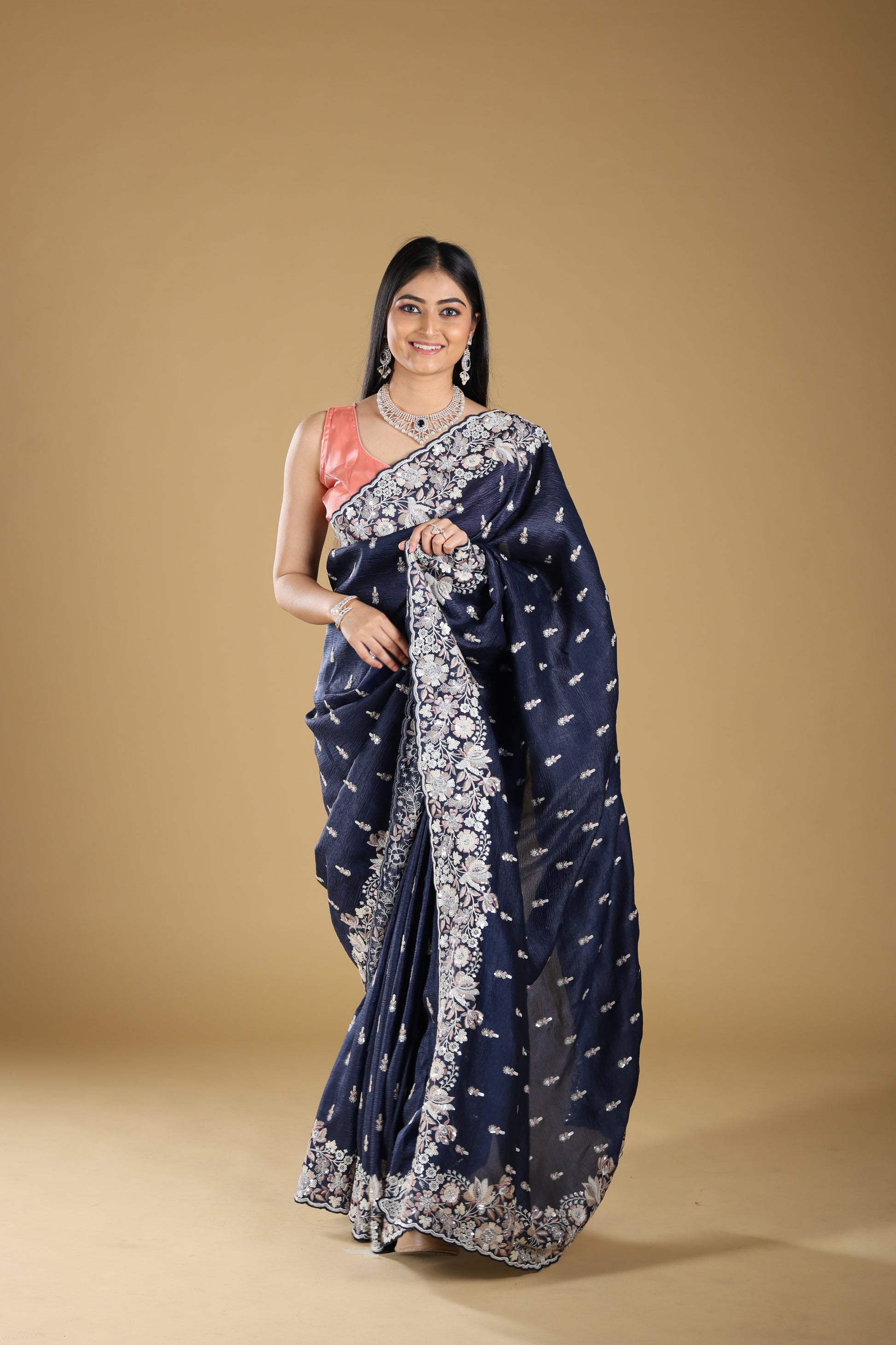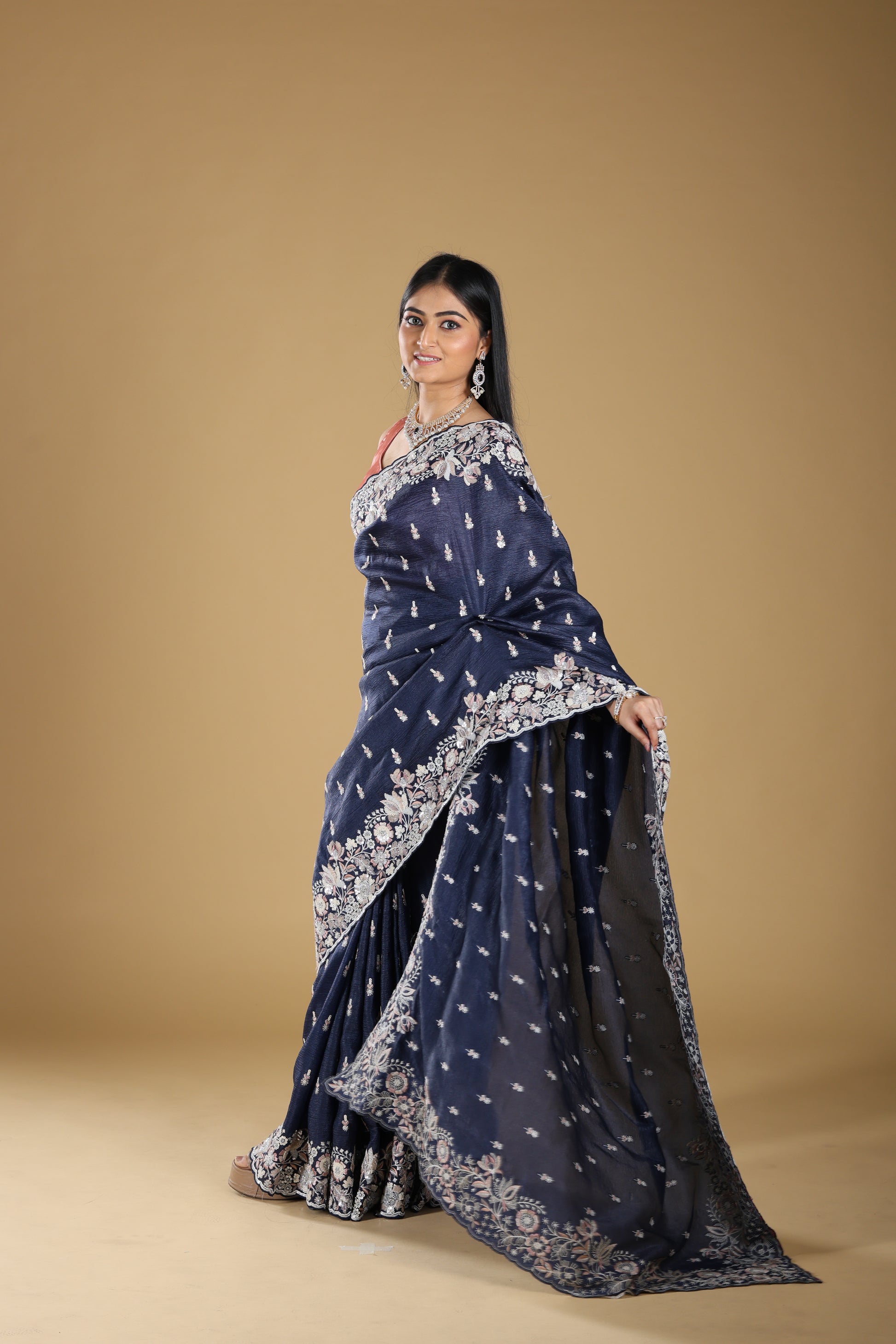 This Floral Design Zardosi Embroidery Saree in a rich blue shade is a masterpiece of elegance and craftsmanship. Made from premium organza with a tissue blend, it offers a luxurious texture and a graceful fall. The exquisite zardosi embroidery with floral patterns adds a royal touch, making it perfect for grand occasions. With a length of 6.5 meters, blouse included, and a height of 42, it ensures a flawless drape. Weighing 1900 gms, this saree is designed to make a bold style statement at weddings, receptions, and festive celebrations.