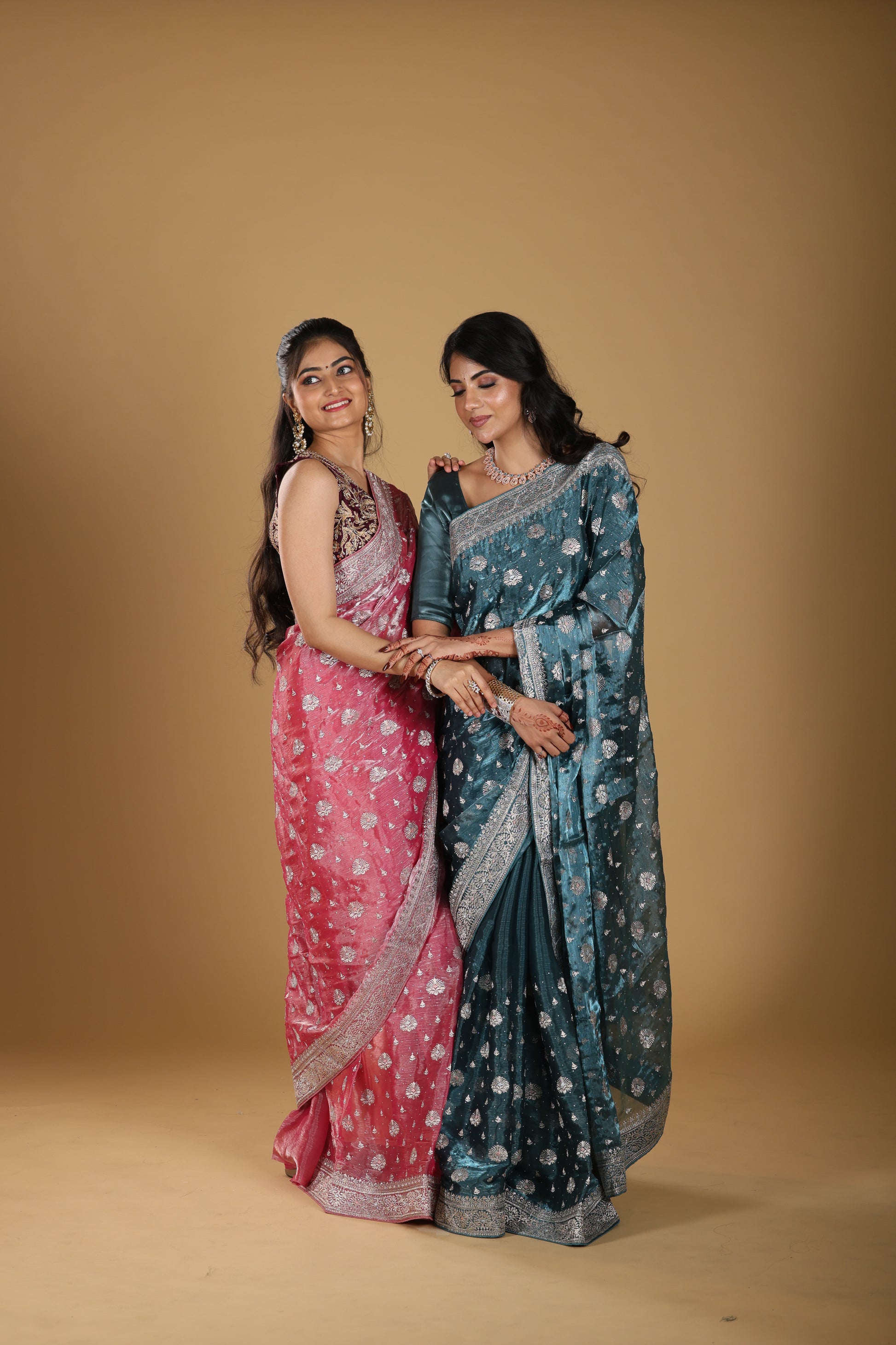 This Organza Sheer Fabric Saree in an elegant pink shade is beautifully finished with a golden zari border, adding a touch of festive richness. Crafted from lightweight organza, it offers a sheer and graceful drape that enhances your traditional look. With a length of 6.5 meters, blouse included, and a height of 42, it ensures both comfort and style. Weighing 1200 gms, this saree is a perfect choice for weddings, festive occasions, and special celebrations where sophistication meets tradition.