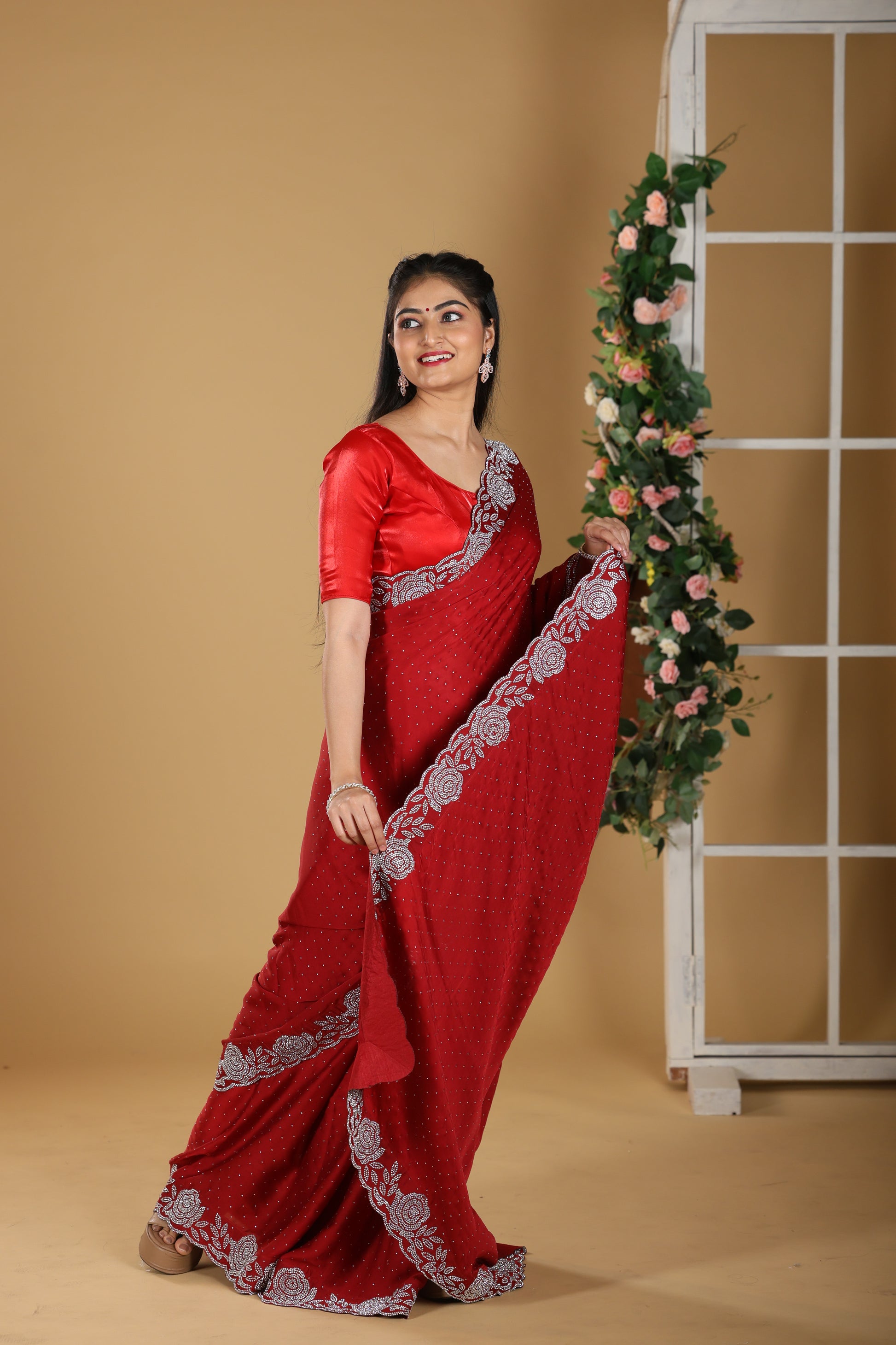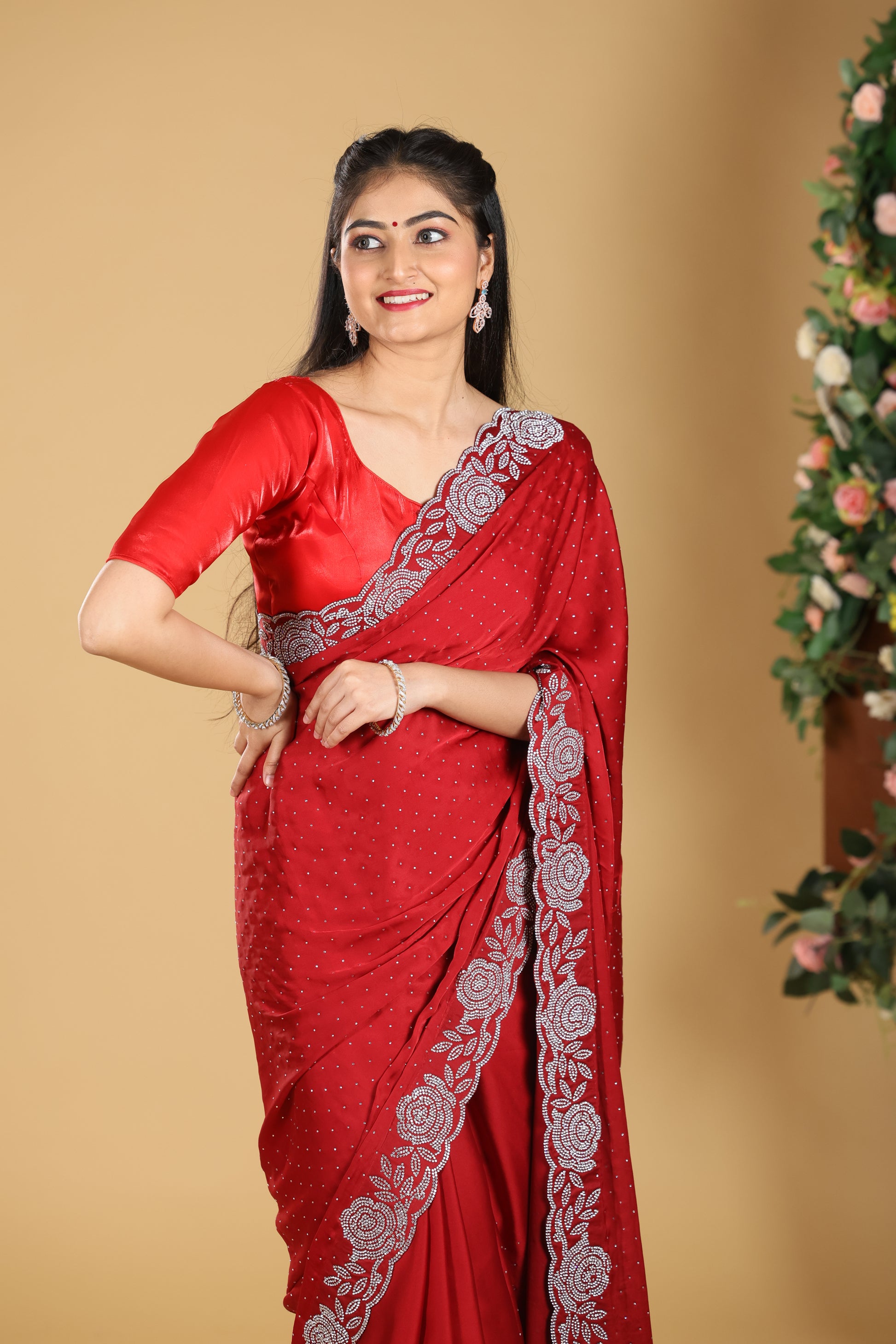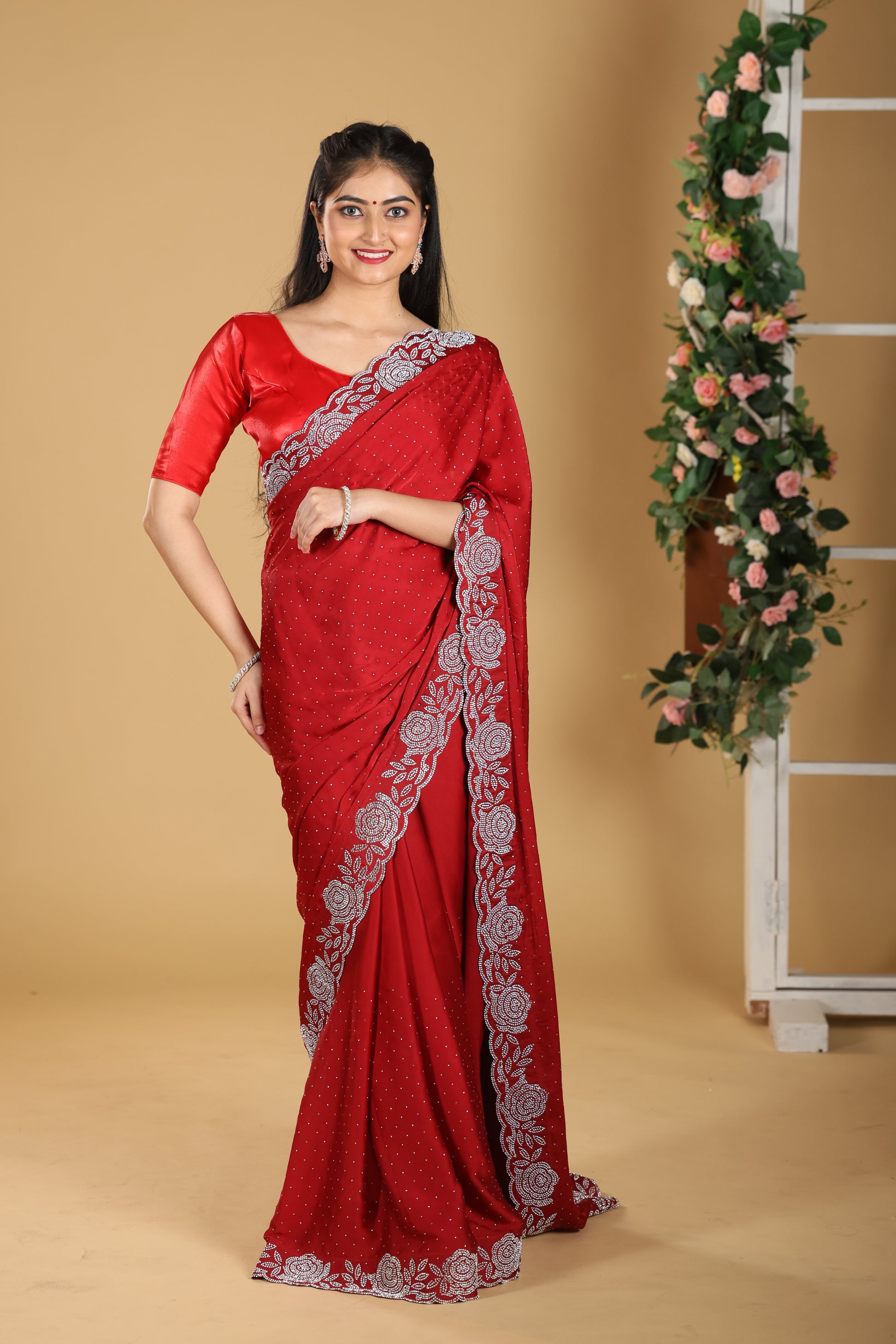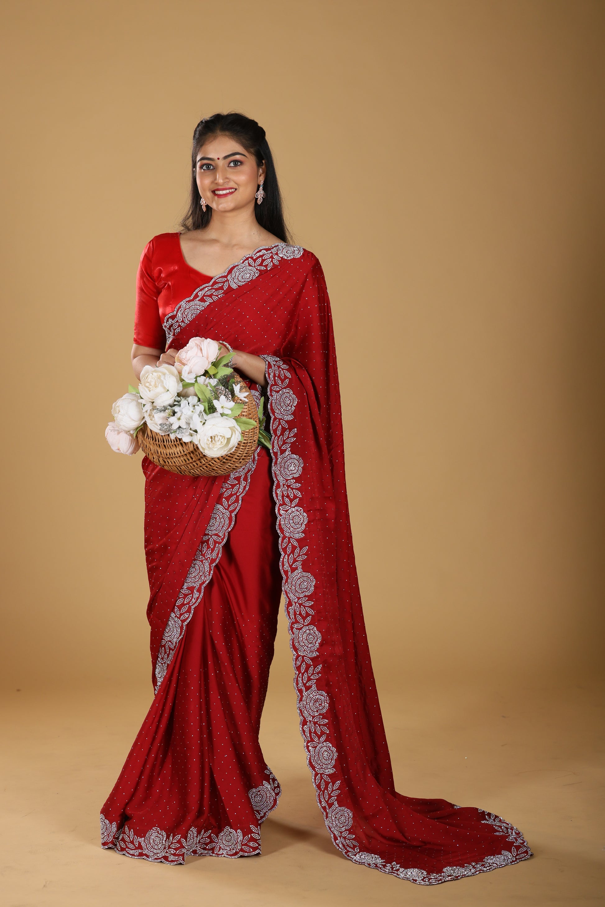 This Premium Line Stone Design Saree in a bold chilly red shade is crafted to exude luxury and sophistication. Made from rich satin silk, it offers a smooth, lustrous texture that drapes beautifully with elegance. Accented with fine line stone work, the saree strikes the perfect balance of subtle sparkle and timeless charm. With a length of 6.5 meters, blouse included, and a height of 42, it ensures a perfect and graceful fit. Weighing 1200 gms, this saree is an ideal choice for weddings, festive occasions, and special celebrations where you want to make a lasting impression.