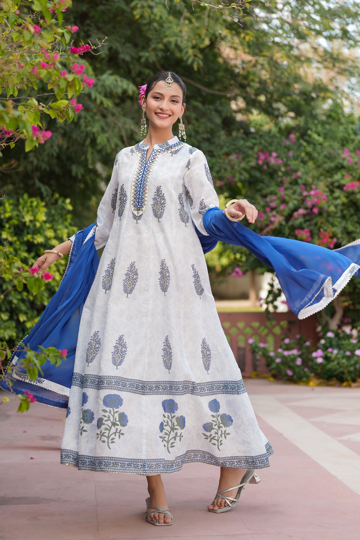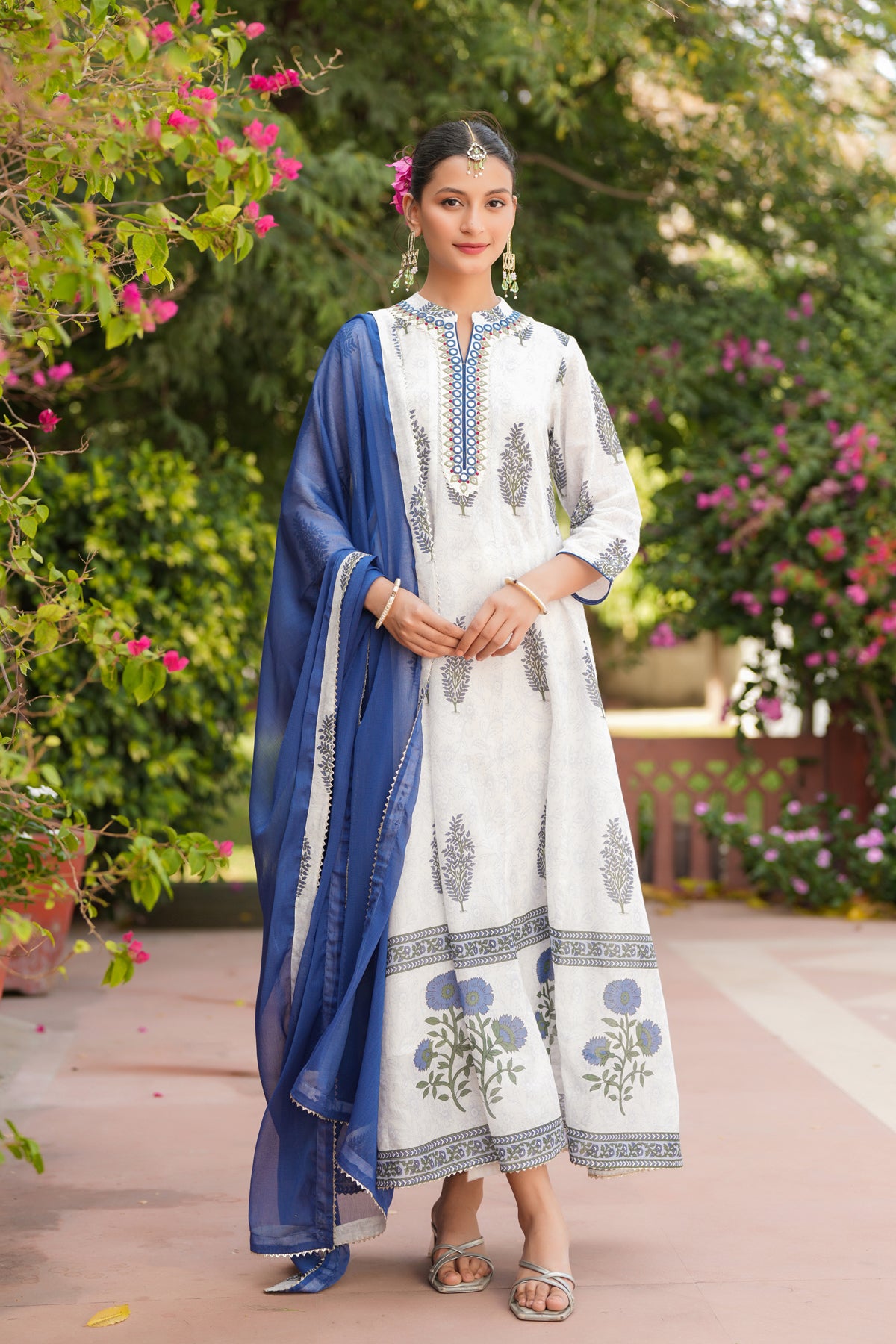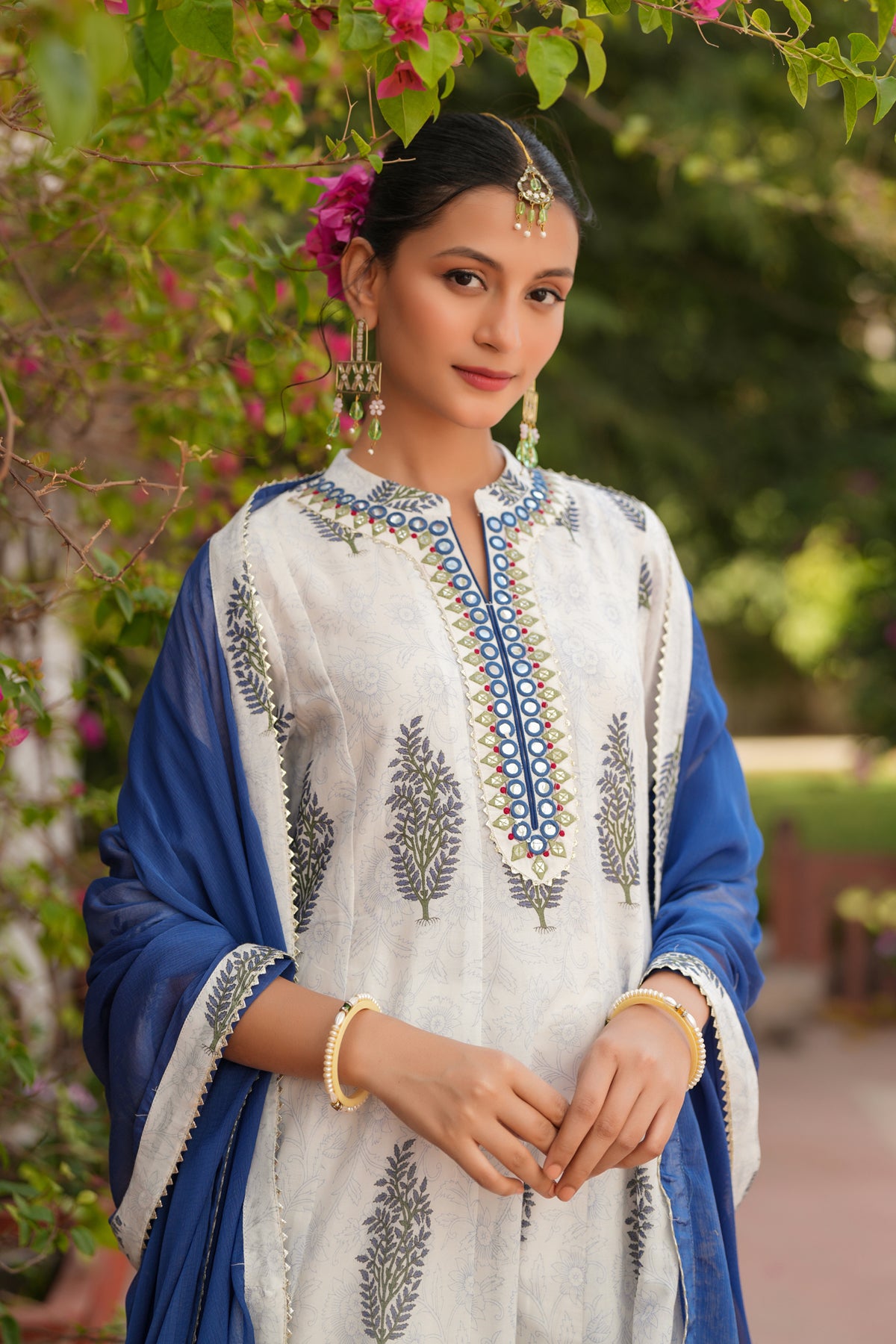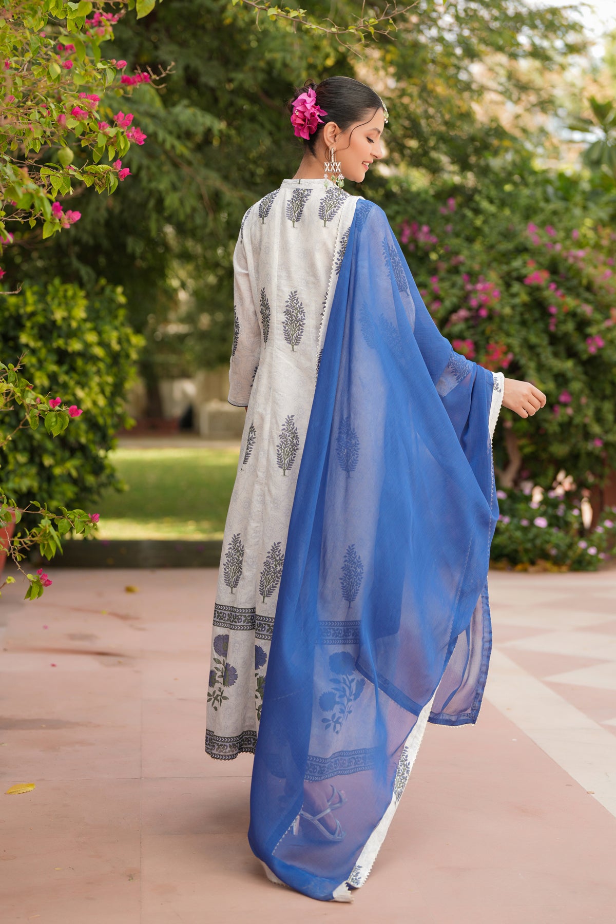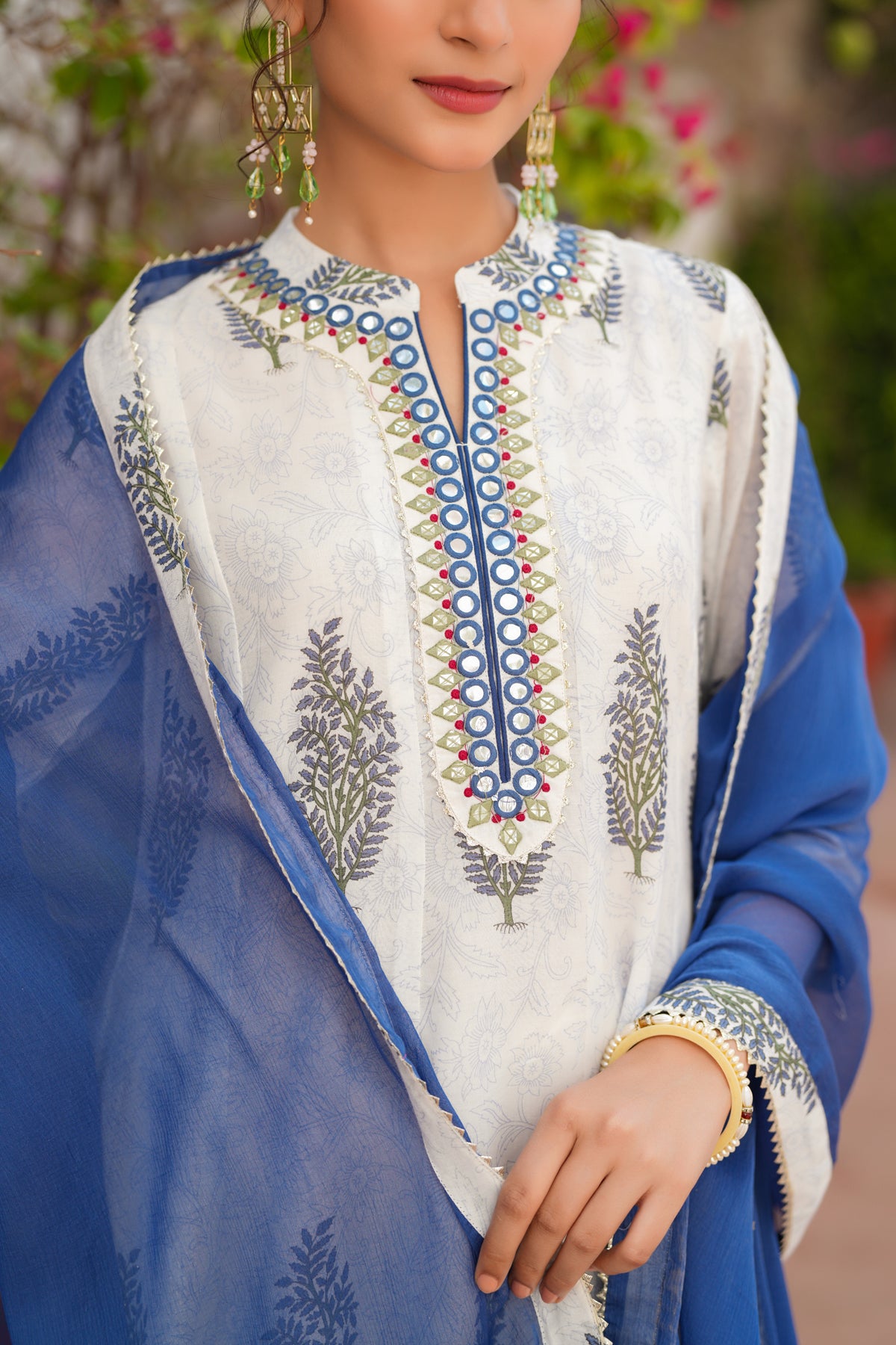 This Pure Cotton Dress in a soothing white with blue shade is a perfect blend of elegance and comfort. The set includes a 53-inch top, 37-inch pant, and an 86-inch dupatta, offering a complete traditional look. Made from breathable pure cotton, it ensures all-day comfort while maintaining a stylish appeal. Ideal for casual wear, festive gatherings, or everyday elegance, this dress adds timeless charm to your wardrobe.