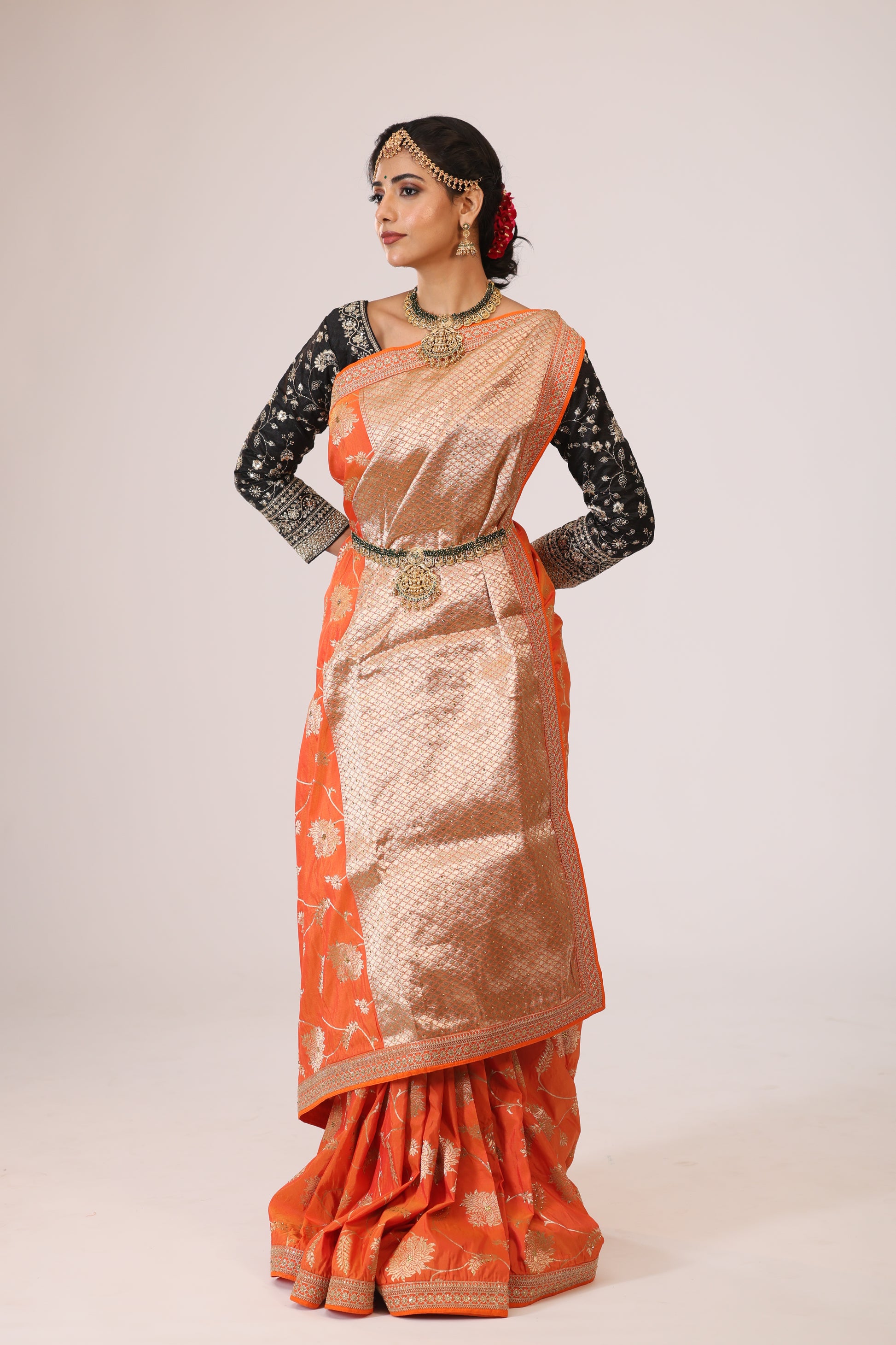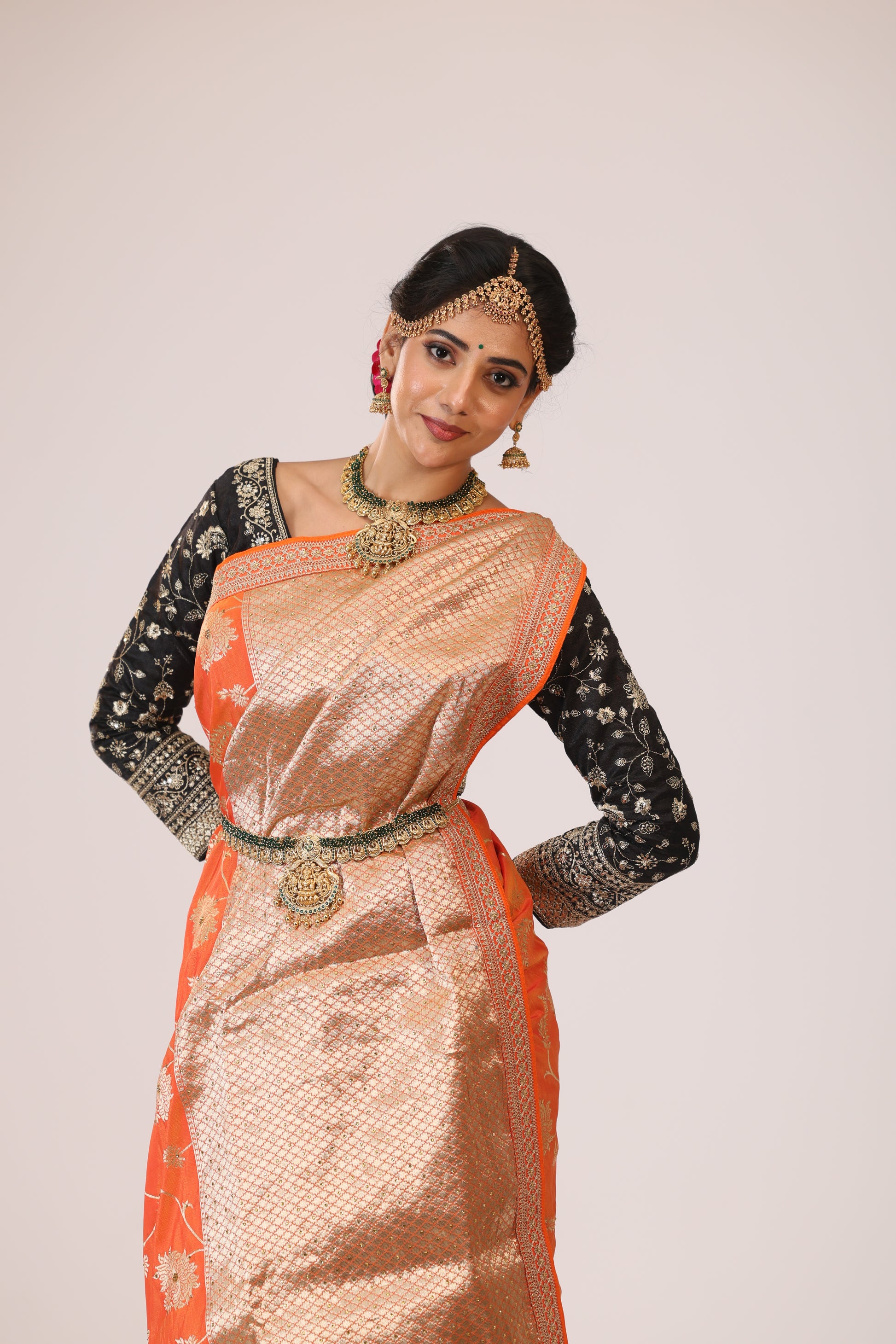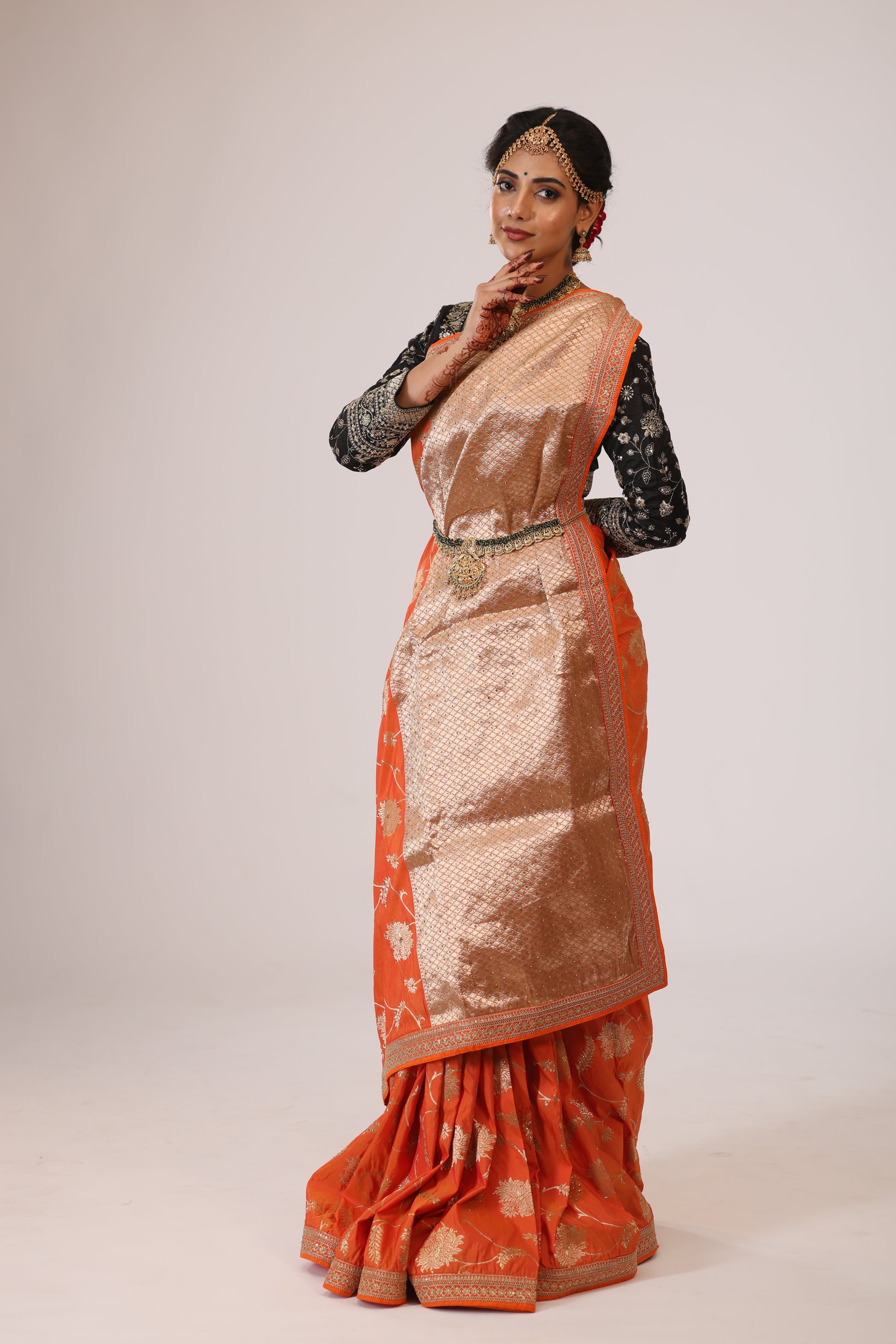 This Traditional Banarasi Silk Saree in a vibrant orange shade is a timeless piece that exudes grace and grandeur. Woven from rich Banarasi silk, it reflects the beauty of intricate craftsmanship and luxurious texture. The saree comes with a length of 6.5 meters and a blouse included, along with a height of 42, ensuring a perfect drape for all body types. Weighing 1200 gms, it offers a regal yet comfortable feel, making it an ideal choice for weddings, festive occasions, and traditional celebrations.