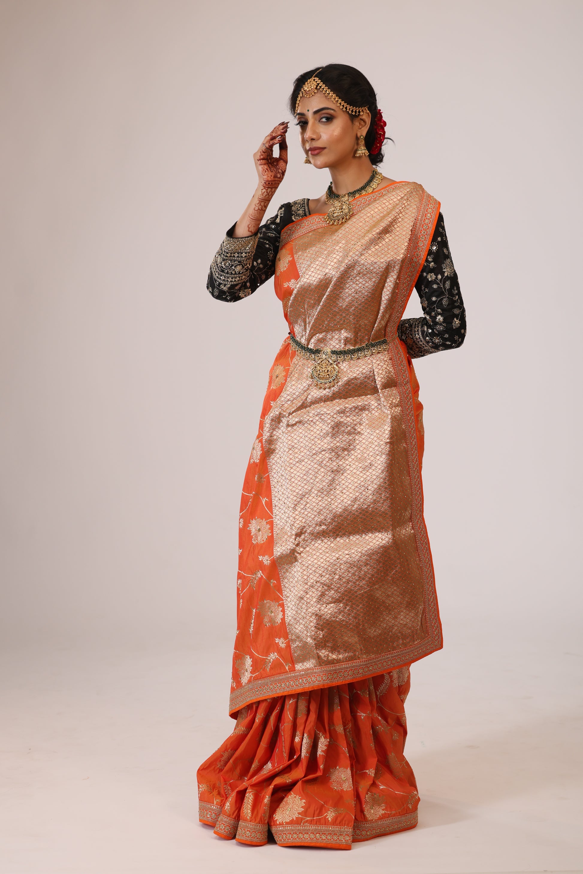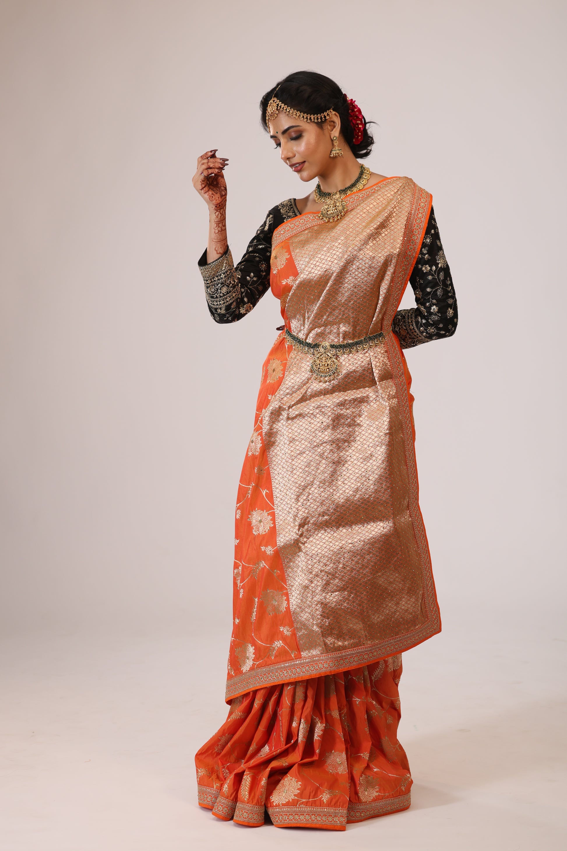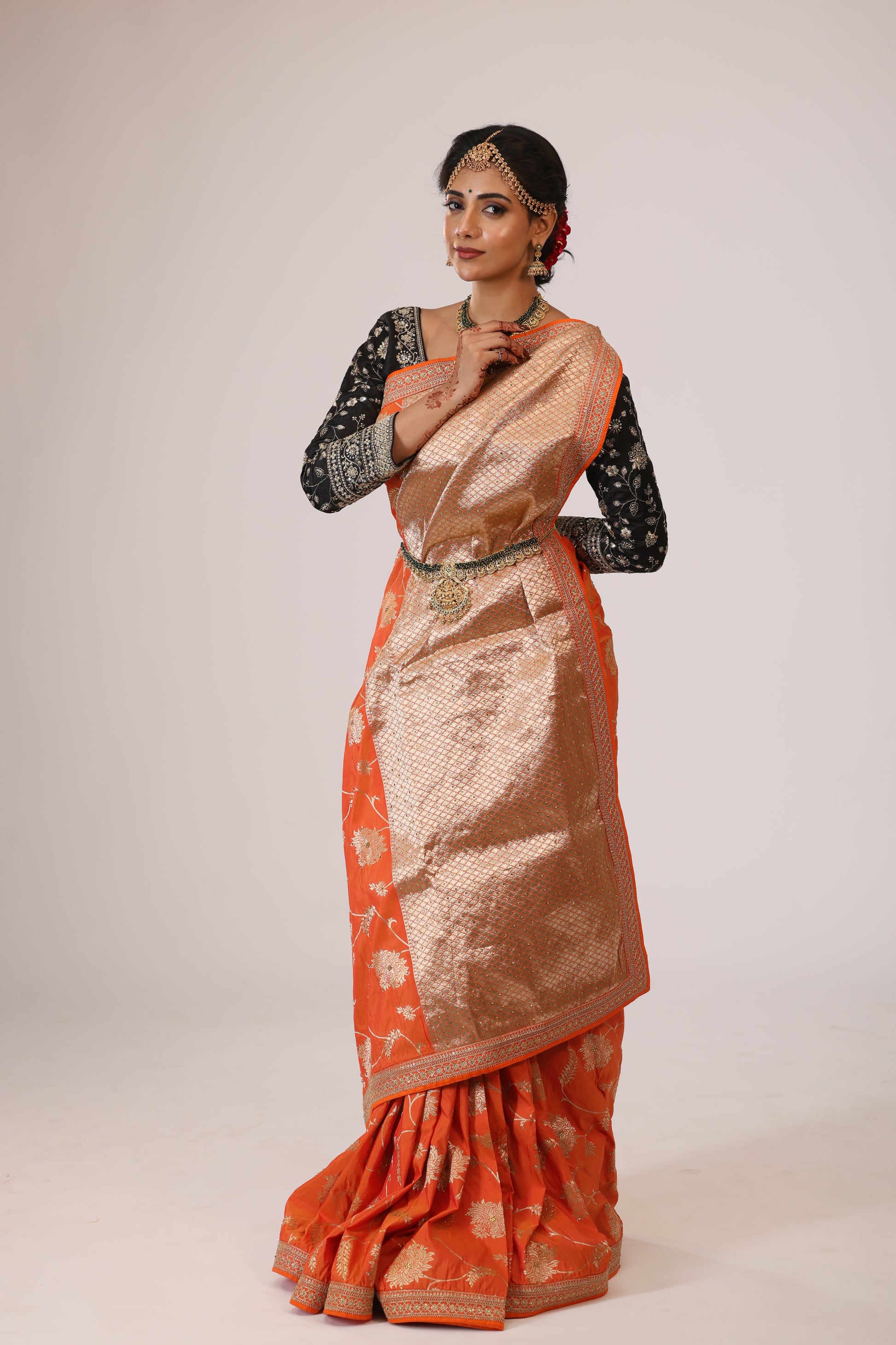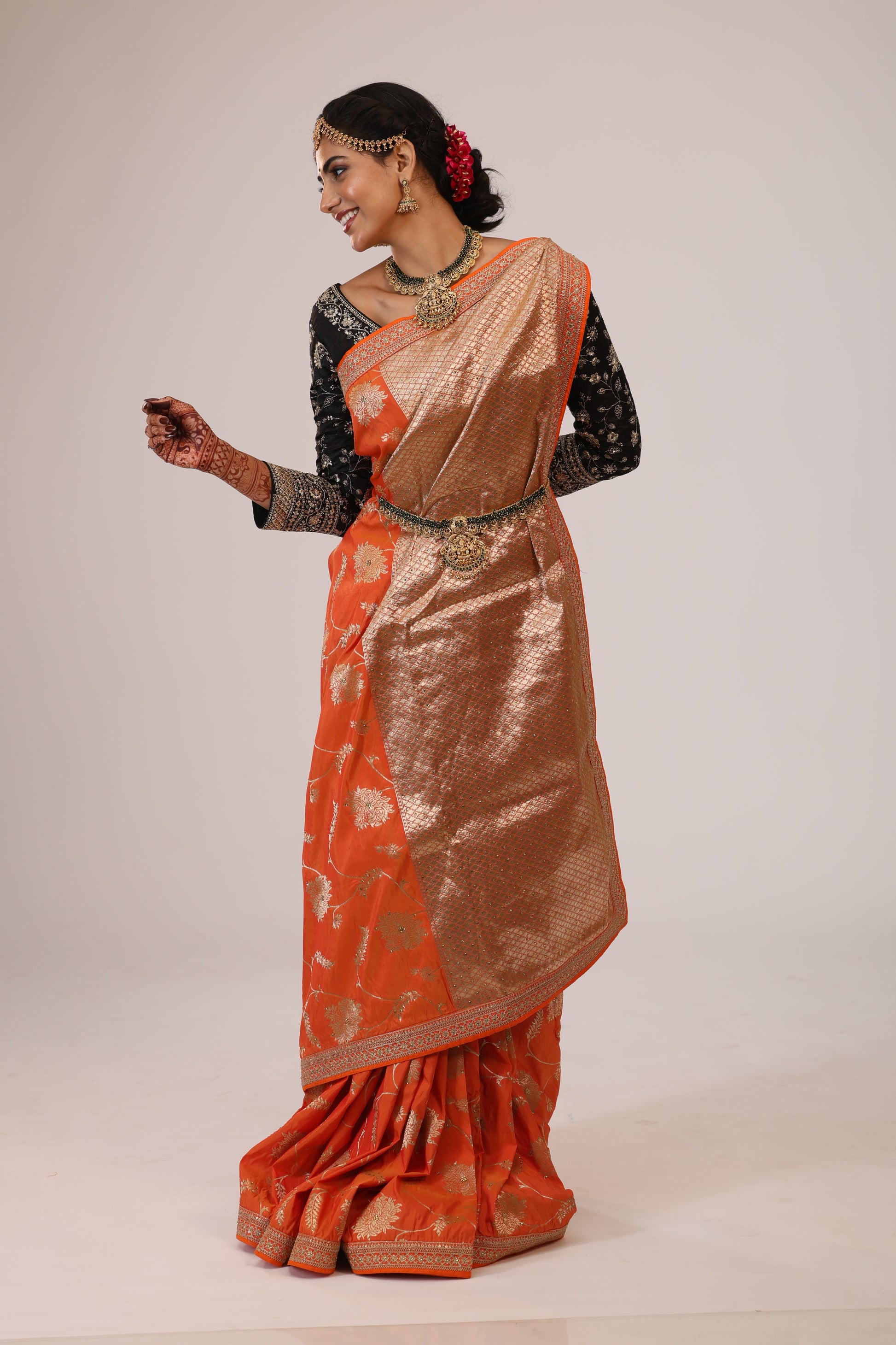 This Traditional Banarasi Silk Saree in a vibrant orange shade is a timeless piece that exudes grace and grandeur. Woven from rich Banarasi silk, it reflects the beauty of intricate craftsmanship and luxurious texture. The saree comes with a length of 6.5 meters and a blouse included, along with a height of 42, ensuring a perfect drape for all body types. Weighing 1200 gms, it offers a regal yet comfortable feel, making it an ideal choice for weddings, festive occasions, and traditional celebrations.